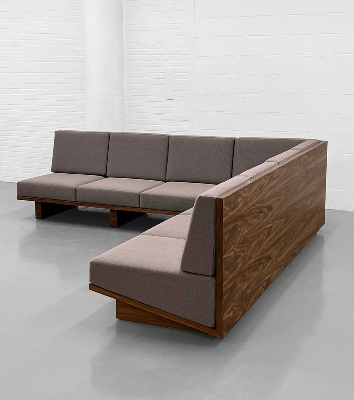 Sectional with wood veneer frame in either stained or natural finish. Seat and back cushion in poly-urethane foam.